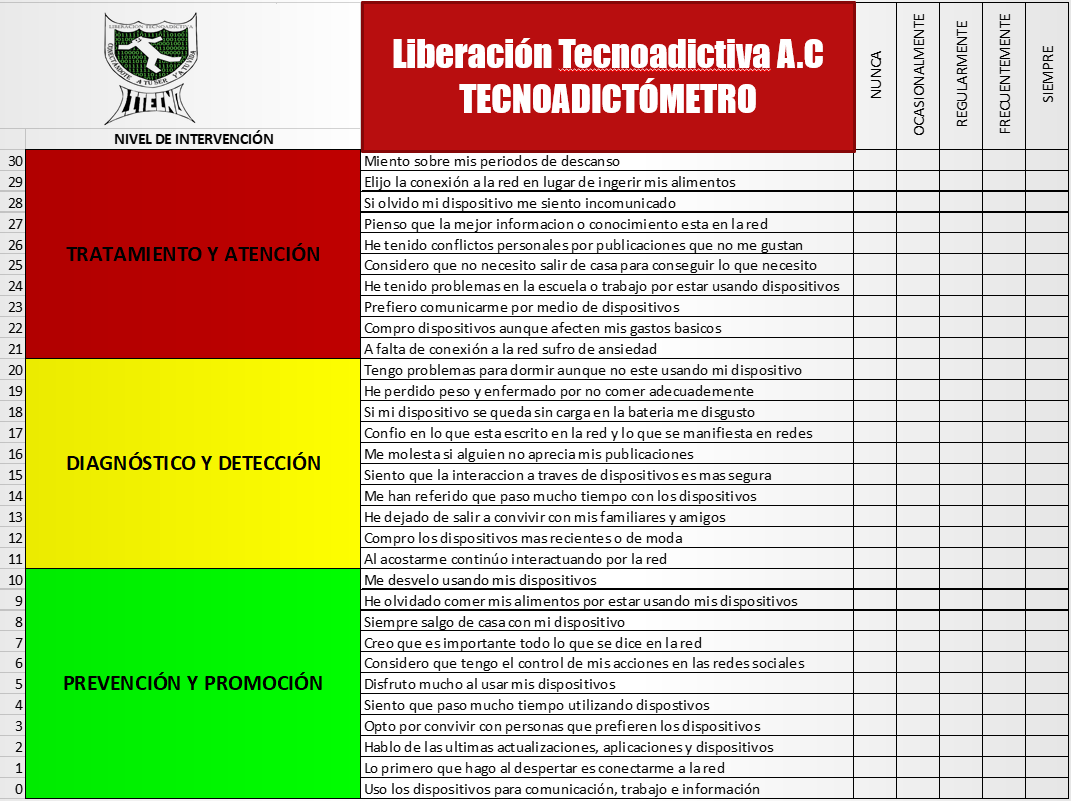Este es un instrumento básico con escala de valoración dividida en tres fases, la primera de Prevención y promoción, la segunda de Diagnóstico y detección y la tercera de Tratamiento y Atención en el uso o abuso de las tecnologías. Tecnoadictómetro realizado por Sánchez Castañeda 2018.