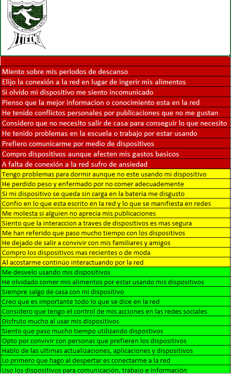 Escala de valoración sobre el uso de las tecnologías, el color verde representa la fase de prevención, el amarillo la de diagnóstico y la roja la de tratamiento indicando de menos a más el grado de codependencia tecnológica que la persona tiene.