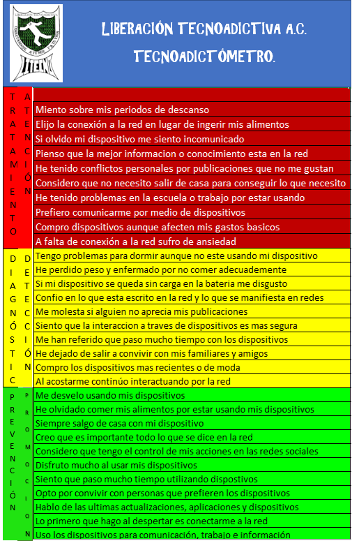 Mediante el tecnoadictómetro las personas de cualquier edad pueden identificar si están proclives a la tecnoadicción, si están en fase inicial o si ya son tecnoadictos y necesitan apoyo profesional.